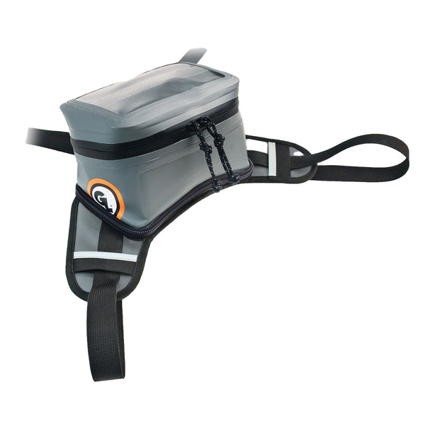 The Buckin’ Roll is a slim, trim, minimalist tank bag designed to keep essentials close at hand while out of the way when riding the most technical singletrack. This easy-to-mount tank bag features fully welded construction with waterproof coated materials and provides 1.5 liters of packable volume for carrying a smartphone, wallet, snacks, smaller tools, or an extra pair of gloves.