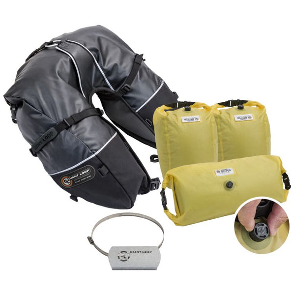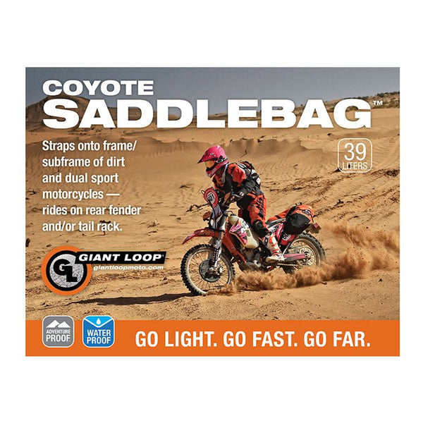 The Coyote Saddlebag is Giant Loop’s original rackless design for packing up to 39 liters of gear on multi-day rides. Built with highly resistant Bomb Shell™ materials, it’s a must have for transporting gear through even the toughest terrain. The Coyote can be mounted to the rear fender or tail rack of virtually any dirt bike, dual-sport, or enduro motorcycle. Includes waterproof inner liner Saddlebag Dry Pods™ and 25-inch Pronghorn Strap™ for complete waterproofing and easy installation.