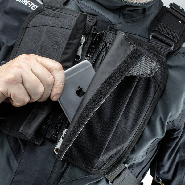 2 concealed pockets built into the front harness provide quick access to money, cards & passport.