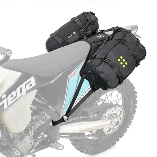 Designed to be a perfect fit on the latest lightweight enduro bikes with a custom shape and specific fitting hardware. The OS-BASE DIRTBIKE is an 'over the seat harness' for mounting OS-6, OS-12, or OS-18 ADVENTURE PACKS as soft panniers, with no need for metal frames or racks. This system provides a super-tough, lightweight carrying solution, with only slight bodywork alterations needed. The fitting hardware gives the flexibility to mount a one, two, or three-pack set-up, depending on your ride. The set-length straps make mounting quick and easy, and the custom shape provides a tight, secure fit with plenty of distance from the exhaust. It takes less than a minute to mount and just seconds to remove it.