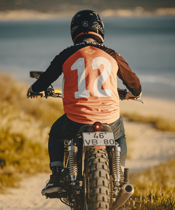 Maria jersey long-sleeved shirts were designed to keep you comfortable, fresh and dry while riding your motorcycle. Either scrambling on dirt or gliding in the asphalt, these jerseys will make you feel light, free, and dressed up for the occasion. With a hint from old time races the "Dirty Jerseys" collection possess the bold and distinctive style that characterizes Maria.